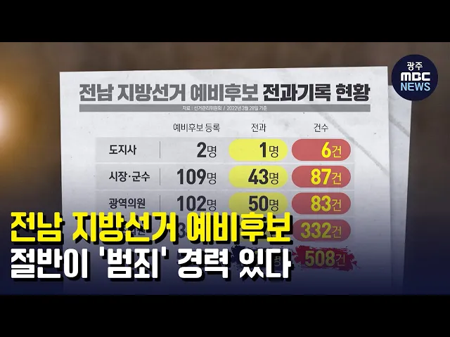 (앵커) 전남에서 지방선거에 뛰어든 예비후보들의 범죄경력을 살펴봤더니 예비후보 10명 중 5명꼴로 전과가 있는 것으로 확인됐습니다. 지금까지 등록을 한 예비후보자들의 전과를 모두 더했더니 5백 건이 넘었습니다. 양현승 기자가 취재했습니다.(기자)누구나 살면서 크고 작은 실수와 잘못을 저지릅니다. 누구도 완벽할 ...