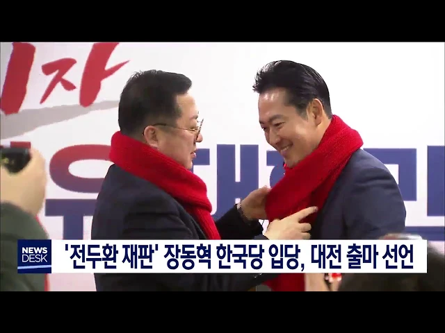 전두환 재판을 심리하다 판사직을 사임한 장동혁씨가 자유한국당에 입당했습니다. 전두환 재판을 진행해오다 지난주 15일 법복을 벗은 장씨는 사임한 지 일주일만인 오늘(23) 자유한국당 대전시당에서 입당기자회견을 갖고 유성구갑 선거구에 출마하겠다고 선언했습니다. 장씨는 기자회견에서 "지난 10일 사직서를 제출하기...
