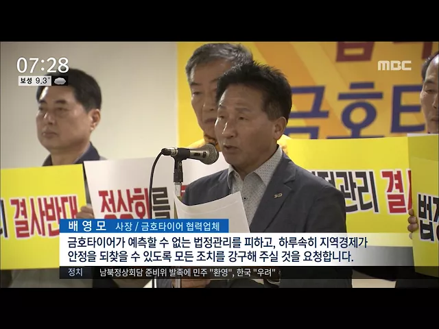 (앵커) 해외매각 논란으로 일촉즉발의 위기를 맞고 있는 금호타이어 문제가 노사를 넘어 지역사회 전반으로 확산되고 있습니다. 하지만 각자 현실 인식이 다르다 보니 자신의 눈높이에 맞춰 해법을 내놓으면서 갈등이 증폭되고 있습니다. 송정근 기자입니다. (기자) 금호타이어의 현주소를 설명하기 위해 사측이 마련한 설...