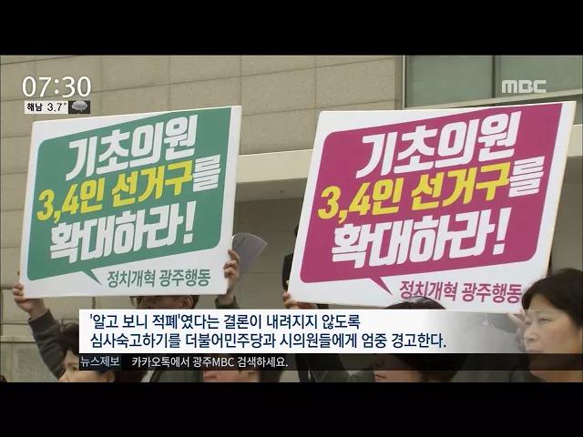 (앵커) 정치개혁 광주행동이 기초의원 선거구 획정 과정에서 3-4인 선거구를 늘리라고 광주시의회와 민주당을 압박했습니다. ◀SYN▶ (각 정당들 특히 더불어민주당은 당리당략이 아니라 정치개혁을 바라는 시민들의 입장을 정확히 반영해야 한다. '알고 보니 적폐'였다는 결론이 내려지지 않도록 심사숙고하기를 더불어민...