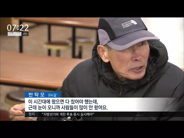 ◀ANC▶ 이렇게 폭설이 내리는 날이면 따뜻한 밥 한끼 먹기가 힘들어지는 사람들이 있습니다. 무료급식소에 밥을 먹으러 가려면 빙판길을 걸어야 하는 노인들인데요. 한파가 찾아오면 가장 힘들어지는 사람들의 이야기.. 김인정 기자가 들어봤습니다. ◀VCR▶ 점심시간, 무료급식소 앞 빙판을 아슬아슬하게 걷는 노인들. ...