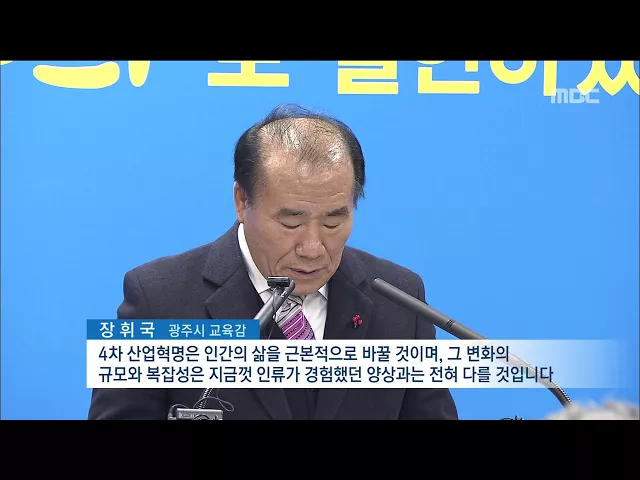 장휘국 광주시교육감이 촛불로 되찾은 민주주의를 광주 학교에서 완성하겠다며 4차 산업혁명에 대비한 교육체제 구축에 적극 나서겠다고 밝혔습니다. ◀INT▶ 장휘국 광주시 교육감 "4차 산업혁명은 인간의 삶을 근본적으로 바꿀 것이며, 그 변화의 규모와 복잡성은 지금껏 인류가 경험했던 양상과는 전혀 다를 것.. 장 ...