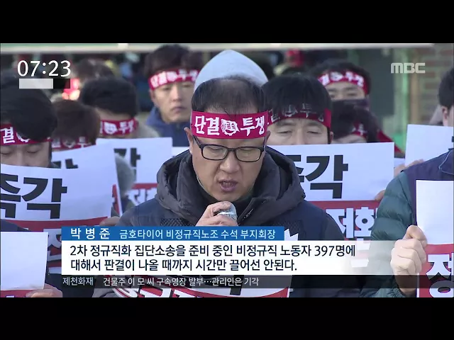 금호타이어의 사내 협력업체 근로자들이 대법원의 판결에 따라 정규직으로 전환됐습니다. 해당 근로자들에게는 다행한 일이지만 경영난에 처해 있는 금호타이어는 구조조정의 칼날을 피해갈 수 있을 지 걱정하고 있습니다. 박수인 기자 ◀VCR▶ 금호타이어에서 사내 협력업체 소속으로 일하던 132명이 7년의 소송 끝에 정...
