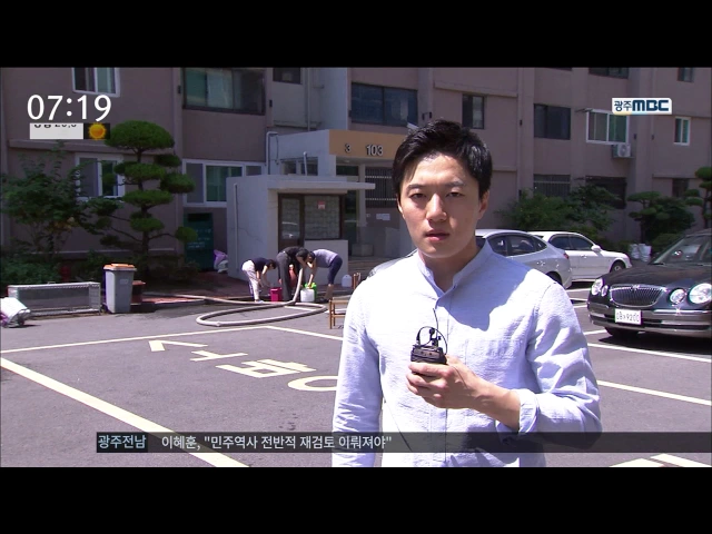 (앵커) 열흘 넘게 폭염특보가 계속되는 푹푹 찌는 무더위에 물을 쓸 수 없다면 어떠시겠습니까? 광주의 한 아파트 저수조에 물이 차면서 660 세대에 물이 끊겨 주민들이 큰 불편을 겪고 있습니다. 송정근 기자입니다. (기자) 아파트 지하 주차장이 물바다로 변했습니다. 곳곳에선 물을 빼내기 바쁘고, 아파트 관계자들은 추...