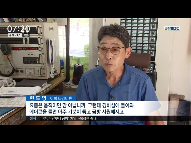 ◀ANC▶ 폭염속 가장 힘든 직종중 하나가 비좁은 경비실에서 장시간 버텨야 하는 아파트 경비원 인데요, 지자체의 지원과 아파트 주민들의 협조로 전체 아파트 경비실에 에어콘이 설치된 지역이 있습니다. 박광수 기자입니다. ◀INT▶ 재활용 쓰레기 분리 작업을 하고 있는 순천 신도심의 아파트 경비원 현도영씨, 찜통더...
