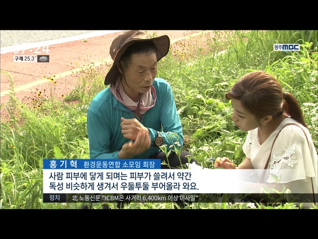 (앵커) ◀ANC▶ 가시박, 도깨비 가지, 돼지풀... 이름도 생소하죠. 남의 집에 버젓이 들어와 살고있는 외래 식물들인데요. 번식 속도가 심상치 않습니다 더 큰 피해를 막으려면 가을이 오기 전에 제거해야만 합니다. 이미지 뉴스리포터입니다. (리포터) ◀VCR▶ 도심 속 시민들의 산책길로 자리잡은 광주천. 강가 옆으로 ...