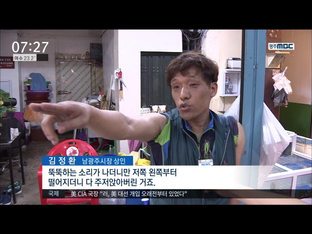◀ANC▶ 남광주시장에서 철제구조물이 갑자기 떨어져 상인과 손님을 덮치는 아찔한 사고가 발생했습니다. 야시장 개장에 맞춰 구조물을 설치한 지 1년도 채 안 돼 부실 시공으로 추정되고 있습니다. 윤근수 기자입니다. ◀VCR▶ 남광주시장 한복판에서 천장에 달려있던 철제 구조물이 연달아 바닥으로 떨어집니다. 무너진...