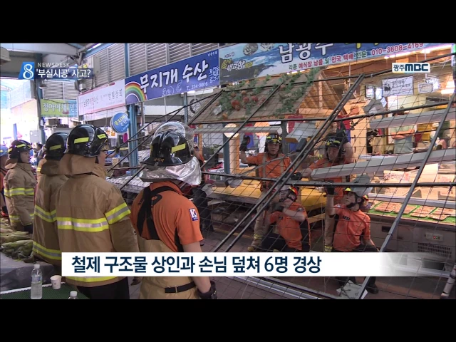 ◀ANC▶ 남광주시장에서 철제구조물이 갑자기 떨어져 상인과 손님을 덮치는 아찔한 사고가 발생했습니다. 야시장 개장에 맞춰 구조물을 설치한 지 1년도 채 안 돼 부실 시공으로 추정되고 있습니다. 윤근수 기자입니다. ◀VCR▶ 남광주시장 한복판에서 천장에 달려있던 철제 구조물이 연달아 바닥으로 떨어집니다. 무너진...