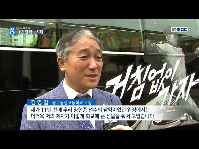 (앵커) 기아의 토종 에이스 양현종 선수가 모교인 광주 동성고에 크나큰 선물을 했습니다. 11년 전 모교를 졸업하면서 세운 자신과의 약속을 지킨 겁니다. 송정근 기자입니다. (기자) 광주 동성고에 검은색 대형버스가 등장했습니다 양현종 선수의 역동적인 투구 동작과 '거침없이 가자'라는 문구가 적힌 버스. 지난 5일 양...