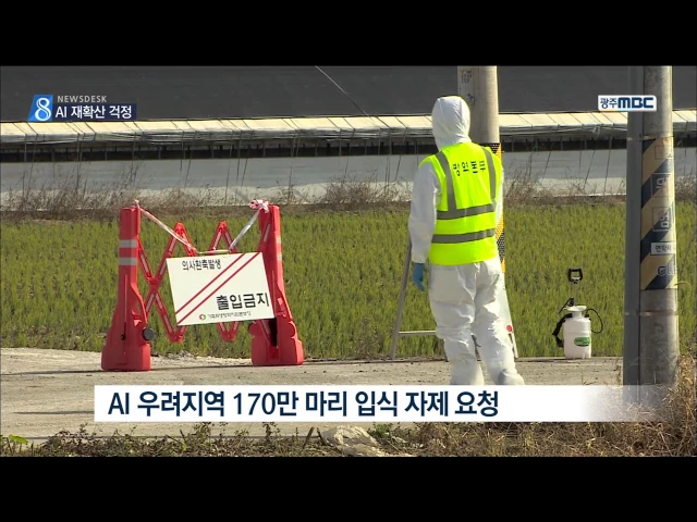 ◀ANC▶ 전남에서 AI의 재확산 기세가 꺾이지 않고 있습니다. 문제는 AI 위험 지역에서 새로 기르기 시작한 오리가 150만 마리가 넘어서 AI 재앙이 재현되지 않을까 우려되고 있습니다. 양현승 기자입니다. ◀END▶ ◀VCR▶ 지난해 11월 이후, 전남에서 발생한 AI는 모두 33건. 스무건은 1월 10일까지 발생했고, 나머지 ...