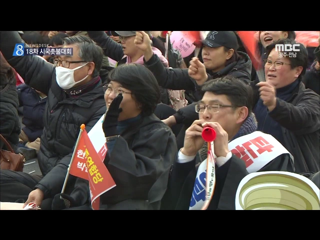 (앵커) 박근혜 대통령에 대한 탄핵 심판 결정이 임박한 가운데 금남로에서는 탄핵 인용을 촉구하는 열여덟번째 촛불집회가 열리고 있습니다. 현장에 나가 있는 취재 기자 연결하겠습니다. 송정근 기자, 금남로에 시민들이 많이 모였습니까? (기자) ((네, 조금 전까지 금남로에는 경찰 추산 명, 주최측 추산 *만명의 시민들...