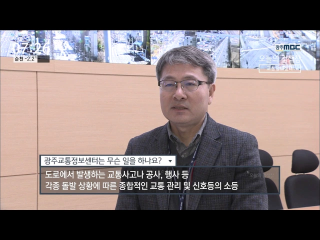 오늘의 검색창 "교통정보센터" (센터직원 전화 받으며 "네 광주교통정보센터 경위 박종관입니다. 광천 사거리 교통사고요~ 네 출동하겠습니다." [오프닝] 우리 동네에 있는 신호는 왜 이리 짧은 걸까 생각한적 많으시죠. 오늘은 광주 교통 신호체계에 대해서 알아 보겠습니다. [인터뷰] 1. 광주교통정보센터에서는 무슨 일...