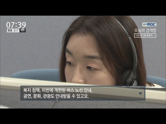 검색어 "120 콜센터" ◀VCR▶ 전화 거는 모습 백수진 아나운서 "첨단 22번 버스노선 변경 알려주세요." 콜센터 직원 "첨단 22번은 첨단에서 시청을 거쳐 서광주역까지 연결을 하고 있고요." 백수진 아나운서 - 오프닝 멘트 - - 콜센터 내부 - 김유미 / 광주시 자치행정과 주무관 "120 빛고을 콜센터에서는 모든 시정에 관...