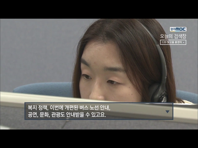 검색어 "120 콜센터" ◀VCR▶ 전화 거는 모습 백수진 아나운서 "첨단 22번 버스노선 변경 알려주세요." 콜센터 직원 "첨단 22번은 첨단에서 시청을 거쳐 서광주역까지 연결을 하고 있고요." 백수진 아나운서 - 오프닝 멘트 - - 콜센터 내부 - 김유미 / 광주시 자치행정과 주무관 "120 빛고을 콜센터에서는 모든 시정에 관...