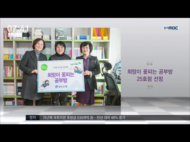 동신대가 위탁 운영하는 장흥 어린이급식관리지원센터가 급식관리 성과 보고회에서 식약처장상을 수상했습니다 ** 광주은행이 광주 북구 본촌동에 위치한 다자녀 가정에서 희망이 꽃피는 공부방 25호점 선정식을 가졌습니다. ** 지난 2014년 12월 첫 운행을 시작한 화순 100원 택시 이용객이 10만 명을 넘어섰습니다. ** 구...