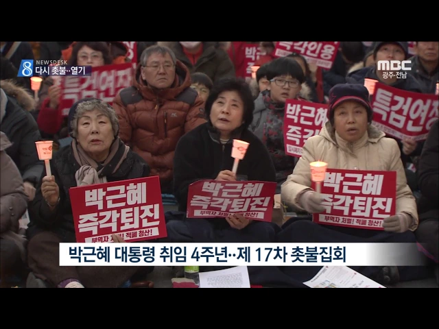 ◀ANC▶ 박근혜 대통령의 취임 4주년이자 탄핵심판 마지막 변론기일 직전 주말인 오늘 전국에서 촛불집회가 열리고 있습니다. 광주와 전남 시민들은 서울로 상경해 광화문 집회에 참석하는 한편, 광주 금남로에서 집회를 이어가고 있는데요. 현장에 나가있는 취재 기자 연결해 봅니다. 김인정 기자, 지금은 어떤 상황입니...