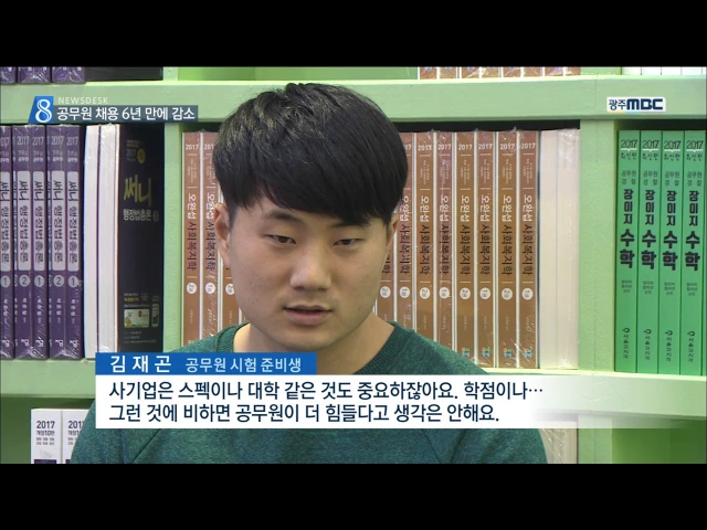 (앵커) 공무원 시험 준비생들에게 반갑지 않은 소식부터 먼저 전합니다. 지방 공무원 채용 인원이 6년만에 처음으로 줄었습니다. 특히 광주는 채용 규모가 다른 시*도보다 훨씬 적어서 경쟁이 더 치열할 것으로 보입니다. 윤근수 기자 (기자) 취업난에 시달리는 요즘 청년들에게 공무원은 손꼽히는 희망 직종입니다. 시험으...