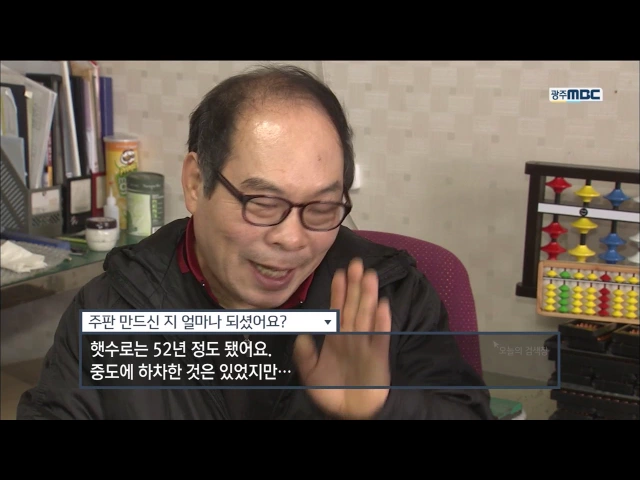 타이틀에 '주판' ( 오프닝 ) 주판과 관련된 추억 많으시죠? 광주에 유일하게 수제로 제작하는 장인이 있다고 합니다. 특히나 요즘에는 주판이 다시금 주목을 받고 있는데요. 오늘은 이 주판에 대해서 이야기해 보겠습니다. (인터뷰 1) Q. 아버님, 지금 뭐하고 계신 거예요? A. 이거 주판 중대, 중간대 구멍뚫고 있는 거예요...