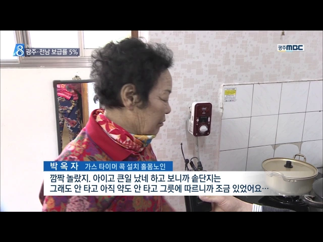 (앵커) '가스 타이머 콕'이라고 들어보셨습니까? 일정한 시간이 지나면 자동으로 가스밸브가 잠기면서 화재를 막아주는 장치인데, 독거노인 등 취약계층에겐 아주 유용한 장치입니다. 그런데 광주 전남 보급률은 5% 정도밖에 되지 않습니다. 송정근 기자입니다. (기자) 혼자 살고 있는 83살 박옥자 할머니는 며칠 전 집에 ...