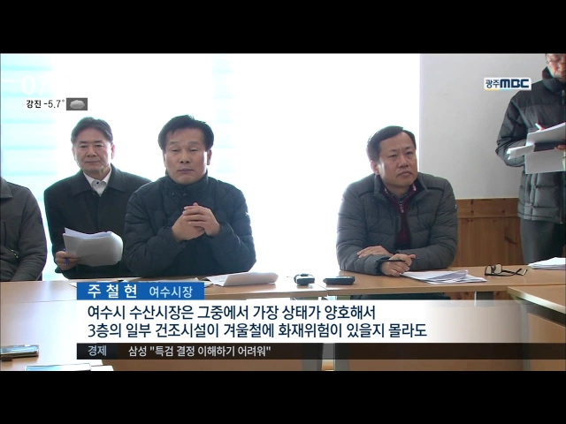 여수 수산시장 화재 원인을 조사하기 위한 정밀 현장 조사가 시작된 가운데 피해 규모가 백억원 대에 이를 것으로 예상됩니다. ** 광주 광산구가 대형마트 휴업일을 변경했다가 특혜 논란이 일자 철회해 빈축을 사고 있습니다 ** 반기문 전 유엔 총장의 대권 행보로 대선 구도가 한층 복잡해진 가운데 ... 국민의당은 문재...