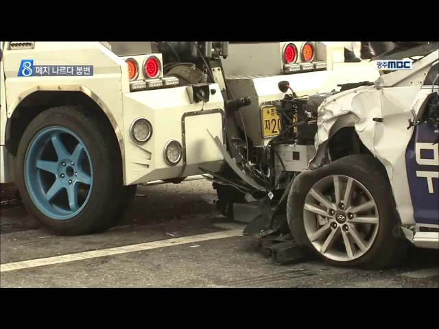 (앵커) 폐지를 나르던 70대 할머니가 택시에 치여 숨졌습니다. 이 택시는 차량 8대도 잇따라 들이받아 택시 기사 등 4명이 다쳤습니다. 송정근 기자입니다. (기자) 종잇장처럼 찌그러져 있는 차량들이 도로 위에 널브러져 있습니다. 도로위의 파편과 현장을 정리하는 사람들로 도로는 아수라장이 됐습니다. 낮 12시쯤, 광주...