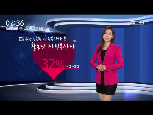 올해 자원봉사에 참여해 본 적, 있으신가요? 광주 지역 자원봉사 센터에 등록된 자원봉사자는 38만 5천명. 광주 시민 네 명 가운데 한 명이 자원봉사를 하기위해 등록했습니다. 이 가운데 실제로 자원봉사 활동을 한 시민은 12만 2천명으로, 전체 등록 인원 중 32%를 차지했습니다. 지난해보다 시민들의 참여가 늘어난 건데...