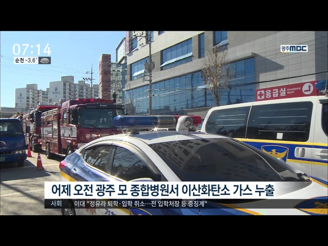 ◀ANC▶ 어제(2) 오전 광주의 한 종합병원에서 가스 누출로 7명이 부상을 입었습니다. 60대 직원이 호기심에 자동소화장치를 조작했다 화재진압용 이산화탄소 가스가 대량 누출된 겁니다. 김인정 기자입니다. ◀VCR▶ (cctv영상) 지하주차장에서 갑자기 희뿌연 가스가 뿜어져나오자 주차관리요원들이 쓰러집니다. 병원 직...