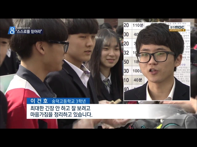 (앵커) ◀ANC▶ 대입수학능력시험이 하루 앞으로 다가왔습니다. 수험생과 학부모들이 가장 긴장될텐데요. 그동안 갈고 닦은 실력을 발휘할 수 있도록 마지막 점검을 하면서 마음을 다스려야 할 때 입니다. 이미지 뉴스리포터입니다. (리포터) ◀VCR▶ 학생들이 수험표를 받기 위해 교단 앞으로 나갈 때마다 박수가 쏟아집...