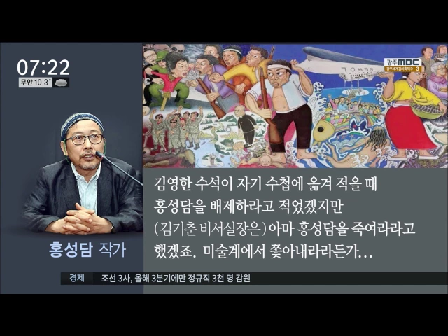 (앵커) 2014년 세월호 참사와 관련해 박근혜 대통령을 풍자한 홍성담 화백의 '세월오월'작품의 전시 무산에 정부의 외압이 있었던 사실을 윤장현 시장이 고백했습니다. 윤시장이 당시 문체부 차관에게서 외압성 전화를 직접 받았고 그 결과 전시가 무산됐다는 겁니다. 먼저 김철원 기자입니다. (기자) 2014 광주비엔날레는 ...