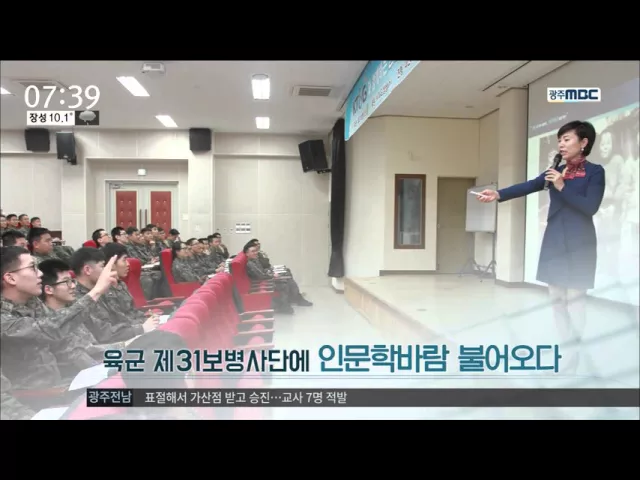 육군 제31보병사단은 KTG의 후원으로 마련한 '인문학 아카데미'의 첫 강의를 열었습니다. 구례군이 아이들의 올바른 독서 습관과 창의력을 높이기 위해 논술교실 운영을 시작했습니다. (5일~) 나주시가 영산강변의 수산자원을 보호하고 불법어업을 막기위한 단속에 나섰습니다. (6) 보성군은 농업인 100여명을 대상으로 노...