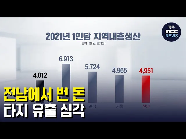 (앵커) 전남의 1인당 지역내총생산 액수가 서울시와 맞먹는 것으로 나타났습니다. 하지만 전남 이외 지역으로 빠져나가는 돈이 많고, 개인의 소득으로 연결되지는 못하고 있었습니다. 김진선 기자가 취재했습니다. (기자)통계청이 2021년 지역소득 잠정자료를 발표했습니다. 전남의 지역내 총생산액은 88조원으로 전국 17개...