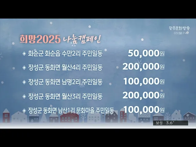 홈오늘의뉴스뉴스데스크뉴스투데이[한걸음 더]취재가시작되자광주MBC단독 prev 2025.2.3 - 월요일 next 광주시 '차없는 거리' 시작부터 빨간불 (앵커)대중교통과 자전거, 보행자 중심의 도로...이른바 대자보 정책을 추진중인 광주시가 올해부터 '차없는 거리'를점차 확대할 계획입니다.하지만 행사성이 짙고, 접근성 등이 낮다는이유로 예산을 제때... 김영창 "올해 1명 입학해요"..초등학교 신입생 모집 전단지까지 (앵커)올해 전남에서는 초등학교 신입생이 단 1명이거나 아예 없다는 소식이 곳곳에서 들려오고 있습니다.심각한 학령인구 감소 위기 속교육당국의 고민도 깊습니다.안준호 기자가 취재했습니다.(기자)전... 안준호 광주 중앙공원 1지구 사업권 향방 주목 광주 중앙공원 1지구 민간공원특례사업의 향방을 가름하는 민사소송 항소심 선고가 이번주 내려집니다.광주고법 민사2부는 오는 6일케이앤지스틸이 우빈산업과 빛고을중앙공원개발를 상대로 제기한 '주주... 이재원 함평 오리농장서 AI 발생, 긴급 방역 실시 함평의 종오리농장에서 H5형 조류인플루엔자 항원이 검출돼 당국이 긴급 방역에 나섰습니다.전라남도는 종오리 만 2천여마리를 사육하고 있는 함평의 한 농장에서 자체 역학 조사 결과 H5형 AI 항원이 검... 이재원 에너지공대 연구소 부지 토지거래 허가구역 재지정 한국 에너지공대 연구소와 클러스터 예정 부지가 토지거래 허가구역으로 재지정됐습니다.기간은 오는 2028년 2월 2일까지 3년으로 해당 구역에서 농지 500㎡, 임야 1천㎡, 그리고 토지 250㎡를 초과해 거... 이재원 교통문화지수 광주 9위·전남 12위…"개선 필요" 지난해 광주의 교통문화지수는 소폭 상승했지만, 전남은 하락한 것으로 나타났습니다.광주 서구의회 김태진 의원이 한국교통공단의 '교통문화지수 실태조사'를 분석한 결과에 따르면 지난해 광주의 교통문... 이재원 [인터뷰온] 2025 광주교육, 이정선 교육감에게 묻는다 (앵커) 벌써 2월입니다 광주시내 학생과 학부모들은 긴 겨울방학을 보내고 있는데요신년계획으로 꼼꼼하게 2025년 광주교육의 방향을 설정하고 학생들과 함께 달릴 준비를 하고 있는 광주시 교육청 이정선... 홍진선 광주시교육청-대학 6곳, 지역 교육여건 개선 협력 광주시교육청이 교육 여건 개선을 위해 지역 대학들과 손을 잡고 나섰습니다.광주시교육청은 전남대와 조선대, 광주교대를 비롯해순천대, 광주여대, 남부대 등 6개 지역 대학과 교육 협력 사업을 추진하기... 이재원 [경남] "벼농사 줄여라" 곧 집집마다 통보 (앵커)정부가 쌀 과잉 공급과 쌀값 하락 문제를 해결하기 위해 벼 재배 면적을 대폭 줄이기로 했습니다.시*도 별로 감축 면적을 할당했고, 조만간 농가에도 감축 면적을 통보할 계획인데 농민단체들은 식... 이준석 [부산] 인공지능 고등학교 문 연다 (앵커)경남 양산에 교명이 '인공지능 고등학교'인 공립 특성화고가 문을 엽니다.3년 뒤면 AI를 잘 다루는 전문 기술인력이대거 배출될 예정입니다.부산문화방송박희문 기자가 보도합니다.(기자)양산 신도... 박희문 올해 농업기반 정비사업에 4천5백억 원 투입 전라남도는 22개 시군과 한국농어촌공사 전남본부와 함께 4천500억여 원을 들여 올해 농업생산기반 정비사업을 추진합니다.주요 국비 투입사업은 배수개선 953억 원와 농촌용수 개발 302억 원, 방조제 개... 김윤 광주시, 도시숲 22개 추가 조성 광주에 도심숲 22곳이 추가로 조성됩니다.광주시는 국비와 시비등 모두 44억원의 예산을 투입해상무시민공원과 동산 초등학교, 용봉 택지 지구등 22곳에 도심숲을 조성하기로 했습니다.광주시는 새로 조성... 이재원 20250203 뉴스투데이 날씨 절기상으로는 봄의 시작인입춘 입니다만,아직 한겨울 추위가 이어지고 있습니다.특히 이번주 많은 눈이 예보되어 있어서각별한 주의가 필요합니다.대체로 흐린 날씨가 이어지고 있는 가운데,광주와 전남 ... 정용욱 희망 2025 나눔 캠페인 2025.2.3.(월) '희망 2025 나눔 캠페인'에 성금을 보내주신 분들입니다.나주시 빛가람동 23통 주민일동 60,000나주시 빛가람동 사랑으로 부영2단지아파트 주민일동 360,000나주시 빛가람동 LH6단지 아파트 주민일동 150,... 정용욱