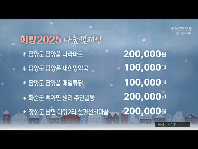 홈오늘의뉴스뉴스데스크뉴스투데이[한걸음 더]취재가시작되자광주MBC단독 prev 2025.2.6 - 목요일 next 올 겨울 최강 한파인데..."같은 추위, 다른 대피소" (앵커)요즘 같은 강추위에 몸을 녹일 수 있도록광주 각 구별로 한파 응급대피소가 운영되고 있습니다.그런데 광주시가 이곳을보여주기식으로 운영하고 있다는 소식얼마 전에 전해드렸었는데요.일부 자치구... 천홍희 "나도 5.18 성폭력 피해자"...남성 피해자 5명 보상 신청 (앵커)5.18 성폭력과 관련한 남성들의 피해는 그간 거의 알려지지 않았습니다.5.18 진상조사위원회는성폭력 사건 16건을 밝혀냈지만,남성 피해는 규명하지 못했는데요.현재 진행 중인 8차 보상에서 남성 ... 김초롱 '제주항공 참사' 국회 특위, 규명 본격화 제주항공 참사 진상 규명을 위한 국회 특위 대응이 본격화됩니다.'12·29 여객기 참사 진상규명과 피해자 및 유가족 피해 구제를 위한 특별위원회'는내일(6) 2차 회의를 열고 국토부, 행안부, 복지부, 경찰... 주현정 선발진 '무한경쟁'.. '경쟁은 기본' (앵커)기아 타이거즈 선수들의 생생한 전지훈련 모습을 살펴보는 기획 보도..오늘은 선발 자리를 놓고 치열한 경쟁을 벌이고 있는국내 선발 투수 후보들을 살펴보겠는데요.전직 메이저리거인 박찬호 선수... 한신구 '학동 참사' 철거 불법 수주..업체 관계자 항소심서 유죄 광주지법 형사2부 김영아 부장판사는17명의 사상자를 낸 광주 학동 참사와 관련해브로커에게 금품을 주고 철거 공사를 따낸40대 이모 씨 등 3명에 대한 항소심에서 징역 4개월에서 1년에집행유예 2년을 각... 김영창 7년간 장애인 착취한 염전업자 항소심서 징역형 광주지법 형사2부 김영아 부장판사는 수년간 염전에서 장애인들을 착취한 혐의로 기소된 50대 남성 장 모씨에 대한 항소심에서 징역 5년과 벌금 200만원을 선고했습니다.장 씨는 신안군에서 염전을 운영하... 김영창 "호수 위 달 그림자 쫓는 듯?" 혼란은 결국 시민 몫 (앵커)탄핵심판에 출석한 윤석열 대통령은 여전히 계엄으로 인한 사회 혼란은외면하는 모습이었습니다."호수 위 달 그림자 쫓는 듯"하다는알 수 없는 변론만 이어지면서,결국 계엄으로 인한 혼란과 피로는... 안준호 아파트 내려온 꽃사슴 무리‥"공존 고민" (앵커)순천 도심속 봉화산 주변에서사슴 무리가 주민들에게자주 목격되고 있습니다.10여 년 전부터 산에 살기 시작한 사슴은번식을 거쳐 개체 수가 급증했는데,최근에는 아파트 단지에접근하는 경우도 늘... 유민호 여수공항 활성화 논의 활활.."체질 개선 시급" (앵커)제주항공 여객기 참사 후 여수공항에 대한 안전성 개선 요구가끊이질 않고 있습니다.전남도와 정치권은 어제(5)내년 섬박람회 개최를 앞두고,여수공항에 대한 시설 보완과 활주로 연장이 시급하다는... 최황지 한전, 광주·전남 장애인 선수 집중 육성 한국전력공사가광주·전남지역 장애인 체육 선수를 집중 육성하기로 했습니다.한전과 광주시, 전남도 등은 오늘(5) 협약식을 갖고지역 장애인체육 선수 고용을 확대해장애인 일자리를 창출하는데 공동 노력... 주현정 홍성칠 집행위원장, 제 1회 광주활동가상 수상 광주 공동체의 발전과 시민 사회 활성화를 기리기 위해 제정된 광주활동가상 시상식이 열렸습니다.광주 NGO시민재단은 오늘(5일) 시상식을 열고 홍성칠 광주진보연대 집행위원장에게제 1회 광주활동가상을... 이재원 [대전] 극우 구심점 '전광훈'.."기독교계 성찰해야" (앵커)탄핵 정국 속 극우 세력의 구심점에 선 전광훈 목사.대전에서 전광훈 목사를 비판해 수년간 법적 다툼을 해온 대전빈들교회 남재영 목사가 최근 대법원에서 승소했습니다.남 목사는 전광훈 목사를 ... 윤소영 [경남] 조선 빅3, '13년 만에 동반 흑자' (앵커)국내 3대 조선업체의 지난해 실적이 13년만에 동반 흑자를 기록했습니다.LNG운반선 등 고부가가치 선박을 집중적으로 수주한 덕택인데 올해 전망 역시 청신호지만 장기적으로는 중국의 견제를 극복... 김태석 광주 소상공인 특례보증 대폭 확대 광주지역 소상공인·자영업자에게 담보없이, 저금리로 대출과 이자를 지원하는 특례보증 규모가올해 늘었습니다.광주시와 광주은행을 비롯한 7개 은행은광주신용보증재단에총 1700억원 상당의 지원금을 출... 주현정 20250206 뉴스투데이 날씨 눈이 내리다 그치기를 반복하고 있습니다.현재 역시 전남 서부지역을 중심으로눈구름대가 머물러있는 가운데시간 당 2cm 안팎의 눈이 내리고 있고요.지난 밤사이장성 상무대에는 20cm 이상영광 염산지역에... 정용욱 희망 2025 나눔 캠페인 2025.2.6.(목) '희망 2025 나눔 캠페인'에 성금을 보내주신 분들입니다.담양군 용면 박두원 10,000담양군 용면 두장마을 주민일동 100,000구례군 산동면 구산마을 주민일동 500,000장성군 동화면 월산1리 주민일동 100,0... 정용욱