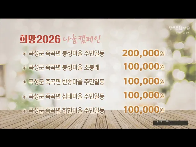 홈오늘의뉴스뉴스데스크뉴스투데이[한걸음 더]취재가시작되자광주MBC단독 prev 2025.12.11 - 목요일 next 한강 작가 노벨상 1주년.."광주를 걷다" (앵커)한강 작가가 노벨문학상을 수상한 지1주년을 맞았습니다.한 작가의 고향인 광주에서는 이를 기념하고 축하하기 위한 다양한 행사들이 열렸는데요.김영창 기자가 보도합니다.(기자) 한강 작가가 2024... 김영창 '역대 최대 호남 예산'...덕담 오간 민주당 최고위 (앵커)더불어민주당이 광주에서 현장 최고위원회의를 열었습니다.호남지역 예산이 역대 최대 규모로 정부 예산에 반영됐다는 점을 적극적으로 알리는 자리였습니다.주로 덕담이 오갔지만 시기가 시기인지... 윤근수 인요한, 국민의힘 의원직 자진사퇴 인요한 국민의힘 의원이비례대표 의원직 사퇴를 선언했습니다.인 의원은 어제(10)국회에서 기자회견을 열고 지난 1년 반 의정활동을 마무리하고 국회의원직을 떠나 본업에 돌아가겠다고 밝혔습니다.이어, ... 유민호 한빛원전 1호기 정비 착수..설계 수명 만료 임박 한국수력원자력은 9일부터한빛원전 1호기에 대한계획예방정비에 착수해발전을 중단했다고 밝혔습니다.한빛원전 1호기는 오는 22일설계 수명이 만료되며한수원은 앞으로 10년간수명을 연장해달라고 원안위... 천홍희 "임금 체불"..나주 아파트서 고공 시위 어제(10) 오후 1시쯤나주시 빛가람동의 한 아파트 옥상에50대 남성이 줄을 달고 매달려있다는 신고가 접수됐습니다.이 남성은 아파트 외벽에 현수막을 내걸고 고공 시위를 벌이다 5시간 만에 스스로 내려... 천홍희 여수~거문도 운항 중단 코앞...주민 '점거 농성' 계속 (앵커)여수와 거문도를 잇는 뱃길이 다음 주 월요일,끊길 것으로 보이면서섬 주민들의 불안감이 커지고 있습니다.여수시와 선사 간 갈등이법적 다툼으로 번지며 합의점을 찾지 못하자,주민들은 해결책을 ... 최황지 광주·부산·구미에 남부권 반도체 혁신벨트 구축 산업통상부가 'AI시대, K-반도체 비전과 육성전략 보고회'를 열고 광주, 부산, 구미에 남부권 반도체 혁신벨트를 구축한다고 밝혔습니다.이에 따라 광주에는 '첨단패키징 실증센터'가 구축돼 기업 RD가 지... 정용욱 광주FC, "이정효 감독에게 최고 예우 보장" 광주FC가 이정효 감독과의 재계약을 위해최고의 예우를 보장하겠다고 약속했습니다.광주FC는 보도자료를 내고 "지난 4년간 구단의 황금기를 이끈 이정효 감독의 리더십과 성과를 높이 평가하며, 시민구단... 김영창 광주시의회 예결위, ACC 실개천·자유총연맹 예산 삭감 광주시의회 예산결산특별위원회가 7조6천8백억 원 규모의 광주시 본예산을 의결했습니다.광주시의회 예결위는 밤샘 계수조정 끝에 광주시가 제출한 예산안 가운데 세출 기준으로 58억 원을 깎는 대신 57억... 윤근수 이재명 대통령에 넘어간 공.. "지역균형 발전 예산 복원하라" (앵커)기재부가 지역방송 예산을152억 원이나 삭감하자,지역 여론이 들끓고 있습니다.지역방송 단체들은지역균형발전을 줄곧 강조해온이재명 대통령에게 공을 넘겼습니다.지역MBC 공동취재단 김세정 기자... 김세정 [울산] 7명 숨진 울산화력 붕괴사고 첫 입건 (앵커)울산화력발전소 붕괴사고와 관련해 경찰이 관계자 9명을 사고 발생 한 달여 만에 처음 입건했습니다.구체적인 사고 원인은 언제쯤 밝혀질지, 책임 소재는 어디까지 확대될지, 향후 수사에 관심이 쏠... 정인곤 [전주] 인생샷 건지려다 조난.. 서해안 고립 사고 잇따라 (앵커)밀물과 썰물 시간이 매일같이 달라지는 서해안은 특히 수위가 높아질 때마다 해안가에 고립되는 사고가 잇따르고 있습니다.대부분이 현지 사정에 어두운 관광객이어서 물때 시간을 확인하는 등 각별... 전재웅 [제주] 건물에서 나오는 탄소 줄인다 (앵커)제주도는 2035년까지 온실가스 배출을0으로 줄이는 탄소중립 정책을추진하고 있는데요제주에서 배출되는 온실가스의 절반 이상이 건물에서 나오는 만큼 친환경적인 녹색 건축을 어떻게 확산하느냐가... 이따끔 광주면허시험장에 자율주행차 시험 센터 구축 광주 북구에 건립 중인 운전면허시험장에 자율주행차를 시험할 수 있는 AI 인공지능 센터가 구축됩니다.해당 센터에는정보기술 기반 운전면허평가시스템과 가상환경 평가시험장이 도입되며, 자율주행 시험... 정용욱 광주 11월 취업자 1만 9천 명 증가 광주 지역의 취업자 수가 2만 명 가까이 증가했습니다.국가데이터처 호남지방통계청이 어제(10일) 발표한 고용동향을 보면, 지난달(11월) 광주 지역의 15살 이상 취업자 수는 78만 4천 명으로, 지난해 같... 김초롱 '보고싶다는 말'..제주항공 참사 추모시집 발간 12.29 제주항공 참사 희생자를 추모하고유가족들의 아픔을 기록한 시집 '보고 싶다는 말'이 발간됐습니다.지난달(11) 세상을 떠난 유가족김경학 화가의 제안으로 시작된이번 추모 시집은 유가족과 전국 시... 천홍희 이웃돕기 성금 12.11. '희망 2026 나눔 캠페인'에 성금을 보내주신 분들입니다.'보성초등학교 500,000구례군 간전면 수달마을 620,000담양군 봉산면 반월마을 주민일동 100,000곡성군 죽곡면 태평마을 주민일동 200,000곡성군 ... 주현정