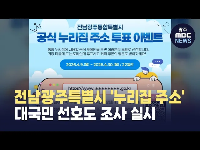 홈오늘의뉴스뉴스데스크뉴스투데이[한걸음 더]취재가시작되자광주MBC단독선거는 중요합니다 prev 2026.4.10 - 금요일 next 전남광주통합교육감 여론조사 김대중 '우세' (앵커)광주MBC 등 지역언론 3사 공동 여론조사 보도, 오늘은 전남광주통합교육감 순서입니다.초대 통합교육감에 대한 지지도 조사에선김대중 전라남도교육감이 우세를 보였습니다.하지만 응답자의 절반은 ... 정용욱 주청사는 광주로, 국립의대는 균등하게.. 지역별 현안 시각차 뚜렷 (앵커)이번 여론조사에서는 통합특별시가 앞두고 있는 지역 현안에 대해서도 물었는데요.통합청사 위치부터 국립의대 배치 방식까지, 현안을 바라보는 광주와 전남 시도민들의시각차는 뚜렷했습니다.향후 ... 이재원 광주·전남 오전까지 비..오후부터 맑아져 오늘(10) 우리 지역은 오전까지 비가 이어지다가오후부터 점차 맑아지겠습니다.아침 최저기온은 11도에서 15도,낮 최고기온은 13도에서 20도로어제보다 따뜻한 날씨가 이어지겠습니다.하지만 오전까지 비... 박승환 결선 앞둔 통합시장 토론회...김영록·민형배 막판 공방전 (앵커)더불어민주당 전남광주통합특별시장결선 투표를 앞두고 김영록, 민형배민형배, 김영록 후보의 합동 토론회가 열렸습니다.정책 주도권을 잡기 위한 비전 경쟁은 물론, 상대의 아킬레스건을 파고드는 ... 박종호 광주경찰, 통합특별시장 주요 선거범죄 직접 수사 광주경찰이 허위 득표율 유포와 단일화 후보 역선택 유도 등더불어민주당 전남광주통합특별시장 경선 과정에서 발생한 주요 선거범죄에 대해 직접 수사에 착수합니다.광주경찰청은 일선 경찰서에 접수되는... 박승환 이정현, 국힘 전남광주특별시장 공천 신청..."득표율 30% 목표" 이정현 전 국민의힘 공천관리위원장이 전남광주특별시장에 출마합니다.이 전 위원장은 어제(9) 보도자료를 내고 국민의힘 전남광주특별시장 후보로 공천을 신청한다고 밝혔습니다.이 전 위원장은 "광주전... 천홍희 강은미, "국민의힘 이정현 전남광주특별시장 출마 규탄" 강은미 정의당 전남광주특별시장 후보는 어제(9) 광주시의회에서 기자회견을 열고 이정현 국민의힘 전 공관위원장의 출마를 규탄했습니다.강 후보는 "내란을 옹호하고 헌정질서 파괴에 앞장서 온 장본인이... 천홍희 민주당 정청래 대표, 1박 2일 광주전남 방문 민주당 지도부가 6·3 지방선거를 앞두고 1박 2일 일정으로 지역을 찾았습니다.정청래 대표는 어제(9) 오전 광양제철소 간담회를 시작으로여수 전통시장인 서시장과 광주 양동시장을 방문해 중동 사태 장기... 정용욱 목포대교, ‘흐르는 빛’ 입는다… 6월 야경 대변신 (앵커)목포항의 관문인 목포대교 경관조명이 새롭게 바뀝니다.고정된 색으로 켜지던 조명이 앞으로는 빛이 파도처럼 흐르듯 방식으로 바뀔 전망입니다.목포항의 또 다른 랜드마크로 주목받고 있습니다.문... 문연철 [경남]'민생'인가 '매표'인가...논란 확산 (앵커)지방선거를 두 달도 채 남겨두지 않은 시점에정부와 경상남도, 그리고 각 시군이 앞다투어 현금성 지원책을 쏟아내고 있습니다.고물가에 지친 민생을 돌보겠다는 취지라지만 하필 선거 직전이라는 ... 신동식 [부산] 1군 아파트 170여 가구 한꺼번에 공매로 (앵커) 1군 업체가 시공한 부산의 대단지 아파트 160여 가구가 한꺼번에 공매 매물로 나왔습니다.준공 후 미분양, 이른바, 악성 미분양 물건인데, 부산 부동산 시장 침체의 한 단면을 보여주고 있습니다.... 이두원 [춘천] 셀프 표창 손본다더니.. 계획도 없이 '차일피일' (앵커)강원도의회가 '셀프 표창' 논란 이후 조례 개정을 약속하고도 수개월째 미루고 있습니다.이번 도의회 임기가 당장 6월이면 끝나는데,도민 신뢰 회복을 위한 제도 개선은 제자리걸음입니다.춘천문화... 김세정 올해 광주에서만 사망 교통사고 15건..경찰, 집중단속 올 들어 광주에서만 15건의 사망 교통사고가 발생하면서,경찰이 신호위반, 무단횡단 등 집중단속에 나섭니다.광주경찰청에 따르면 지난달 14일 광주 동구 동명동의 한 도로에서 불법 유턴을 하던 택시가 ... 박승환 "이대로는 못 죽어"..강제동원 피해자, 일본 찾아 사죄 촉구 일제 강제동원 피해자와 유가족 등이 전범기업과 일본 정부의 사죄와 배상을 촉구하기 위해 일본을 찾았습니다.일제강제동원시민모임에 따르면 강제동원 피해자인 96살 정신영 할머니와고 이춘식 할아버지... 박승환 전남광주특별시 '누리집 주소', 대국민 선호도 조사 실시 전남광주통합특별시 출범에 앞서 누리집 주소 선정을 위한 대국민 선호도 조사가 진행됩니다.이번 선호도 조사는 오는 30일까지 3주간 온라인 설문으로 진행되며, 참여자는 7개의 후보 중 가장 선호하는 ... 서일영 내년 ‘아태 오케스트라연맹 총회’, 광주서 개최 내년에 광주에서'아시아-태평양 오케스트라 연맹 총회'가 열립니다광주시는 지난 1일 일본 가와사키에서 열린'아시아-태평양 오케스트라 연맹 총회' 폐막식에서 이같이 결정됐다고 밝혔습니다.이 총회는아... 정용욱