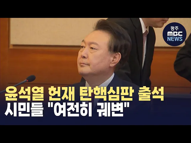 (앵커) 윤 대통령은 오늘 헌재에서"자유민주주의 신념을 확고히 갖고 살아왔다"고 밝혔습니다.시민들은 궤변이라며신속한 파면을 촉구했습니다.김규희 기자가 보도합니다.(기자)내란 우두머리 피의자 윤석열 대통령이양복을 입은 채 모습을 드러냈습니다.헌법재판소에서 열린 탄핵심판에 출석한 겁니다.윤 대통령이 공식 석...