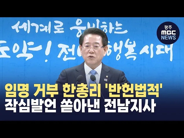 (앵커)김영록 지사가 기자간담회에서 한덕수 대통령 권한대행에게빠른 헌법재판관 임명을 촉구하며 작심 발언을 쏟아냈습니다.정국 혼란을 멈추기 위해이같은 반헌법적 행위를 멈추고 빠른 탄핵 심판을 해야한다는 겁니다.안준호 기자가 보도합니다.(기자)전라남도의 송년기자간담회.김영록 지사는 작심한 듯 '월권적 행위'...