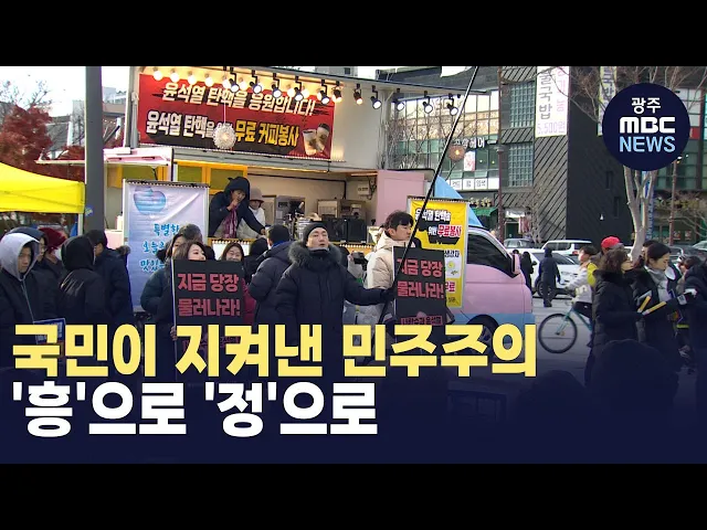 (앵커)21세기 비상계엄 선포라는 믿기 힘든 현실 속에서도 시민들은 '흥'과 '정'이라는 민족 정체성을 지키며 세상을 바꾸고 있는데요.집회는 축제로 변했고, 시민들은 따뜻한 음식을 나누면서 서로를 보듬었습니다.김규희 기자가 보도합니다.(기자)광장에 등장한 푸드트럭에 사람들이 삼삼오오 모여듭니다.자세히 보니 '윤...