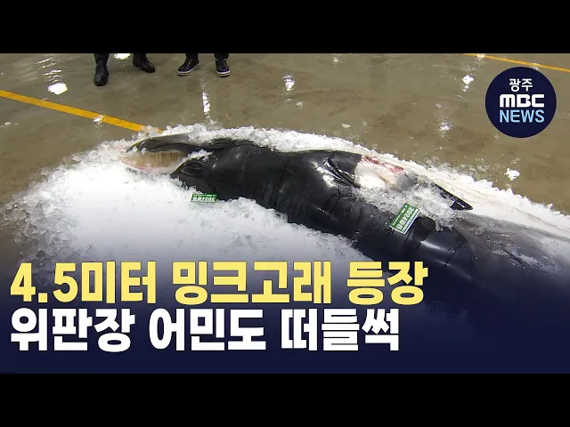 (앵커)전남 서남해안 앞바다에서 4.5미터 길이에 달하는 밍크고래가 혼획됐습니다.보기 드문 손님의 갑작스런 방문에새벽 수산물 위판장도 소란스러웠습니다.안준호 기자가 취재했습니다.(기자)밧줄에 묶인 고래 한 마리가 크레인에 들려 화물차에 실립니다.어제(16) 오후 6시쯤 완도군 여서도 남서쪽 13km 해역에서 조업 ...