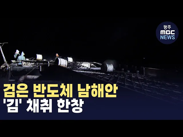 (앵커)고흥에서는 제철 맞은 생김 채취가 한창입니다.지난해보다 생산량은 줄었지만높은 품질과 수요 덕분에가격이 올라 어민들의 표정이 밝다고 하는데요.김 수확 현장을 김단비 기자가 다녀왔습니다.(기자)칠흑 같은 어둠 속, 불을 밝힌 배 한 척이 부표에 다가갑니다.100m 길이의 김발을 끌어올리자김이 한가득 딸려 나...