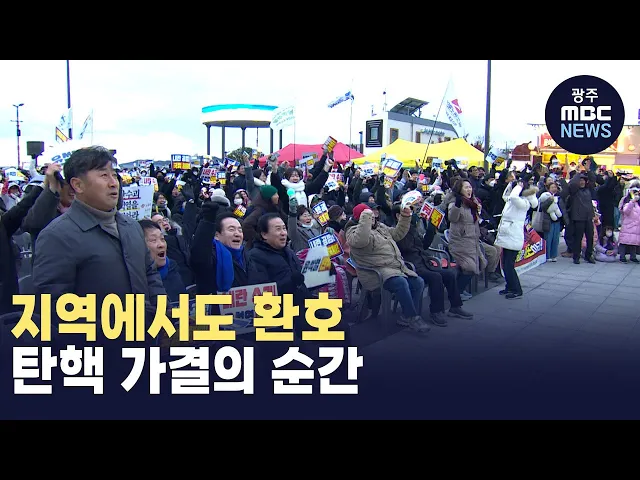 (앵커)목포 등 전남 지역에서도 거리 곳곳에 나와있던 시민들은 "민주주의의 승리"라며 기쁨과 감격의 순간을 함께했습니다.김규희 기자입니다.(기자)"가 204표."윤석열 대통령에 대한 국회의 탄핵 투표가 가결된 순간.시민들은 두 팔을 번쩍 들고, 감격의 눈물을 흘리면서 기쁨을 만끽했습니다.* 최기종/시민"갑자기 가슴...