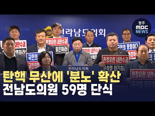 (앵커)탄핵안 무산에 대한 분노의 목소리는전남에서도 이어지고 있습니다.전남도의원들은 오늘(9)단식 농성에 들어갔고,시민들은 계속해서 대통령 탄핵에 목소리를 높이고 있습니다.김단비 기자입니다.(기자)국민의힘 1명을 제외한더불어민주당, 진보당, 정의당 소속 전남도의원 59명이 릴레이 단식을 선언했습니다.짓밟힌 ...