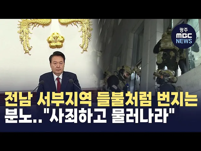 (앵커)비상계엄은 윤석열 정부의 국정 난맥상과 대통령 부부의 각종 비리의혹 등으로 끓어오르던 국민들의 분노에 기름을 붓는격이 됐습니다.전남 서부지역 시민들은 피와 땀으로 일궈온 민주주의에조종을 울리려했다며,윤석열 대통령은 즉각 자리에서 내려오라고목소리를 높이고 있습니다.안준호 기자입니다.(기자)총검을 ...