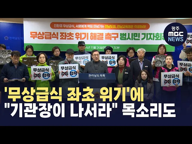 (앵커)한편 전라남도에서는내년도 학교 무상급식 예산안 편성을 둘러싼 갈등이 식지 않고 있습니다.급기야 학부모와 학교 현장관계자들까지'무상급식 좌초 위기' 해결을 촉구하며범시민 기자회견에 나섰습니다.안준호 기자가 취재했습니다.(기자)'무상급식 좌초 위기' 해결 촉구라는 피켓 아래'도지사'와 '교육감'이라는 이...