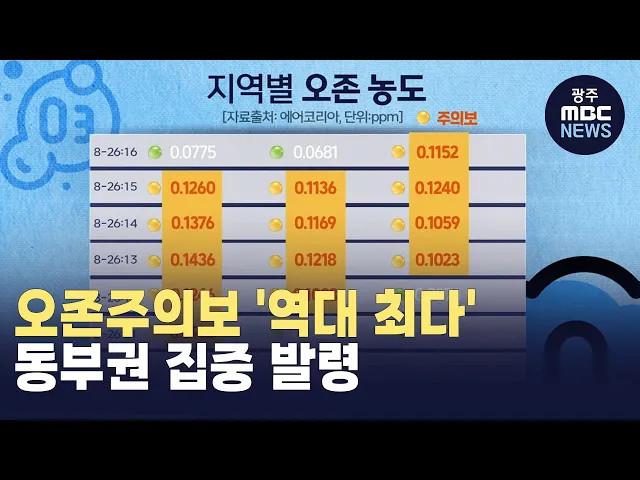(앵커)장기간 지속된 폭염 등의 영향으로오존까지 기승을 부리고 있습니다.올해 전남지역 오존주의보 발령 횟수가역대 최대치를 기록했는데, 산업단지가 밀집한 동부권에 집중됐습니다.문형철 기자입니다.(기자)특정 지역의 대기 정보를 보여주는 온라인 페이지입니다.지난 26일 낮 12시,순천시 장천동의 오존 농도가0.1ppm...