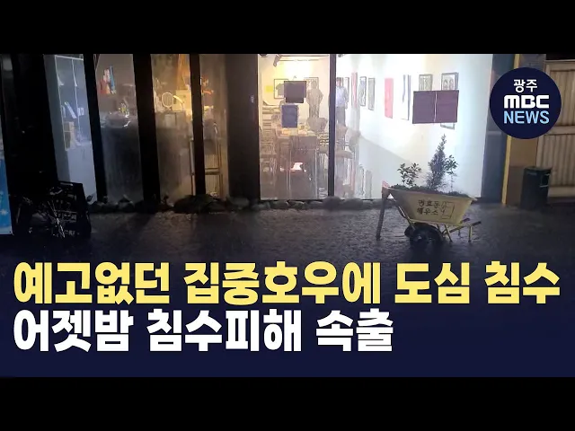 (앵커)어젯밤(27) 광주를 비롯한 전남 서부권에집중호우가 쏟아졌습니다.야구장에서는 갑자기 쏟아진 비로기아 타이거즈가 '강우콜드승'을 거두기도 했죠.목포에는 시간당 54.7mm의 거센 소나기가 내리면서 주택과 상가 100여 동이 침수됐습니다.김규희 기자가 보도합니다.(기자)한밤중 갑작스레 내린 폭우에 목포 도심 도...