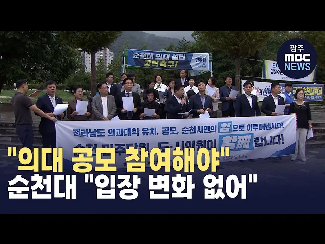 (앵커)지역 정치권을 중심으로순천대학교가전라남도의 의대 공모에참여해야 한다는 주장이 커지고 있습니다.더불어민주당순천·광양·곡성·구례갑 소속 시·도의원들이 순천대 앞에서 성명을 발표했는데요.하지만 순천대는공모에 참여하지 않겠다는 기존 입장에는변함이 없다고 선을 그었습니다.유민호 기자입니다.(기자)더불...