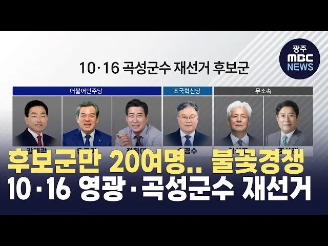 (앵커)오는 10월16일, 영광군과 곡성군에서는 군수 재선거가 치러집니다.예비후보 등록이 시작됐는데, 자천타천 후보자만 20여명에 달합니다.더불어민주당 못지않게 조국혁신당을 내걸고 뛰는 후보도 상당합니다.주현정기자입니다. (기자)공직선거법 위반 혐의로 군수들이 중도에 낙마한 영광군과 곡성군수 재선거가 70여일...