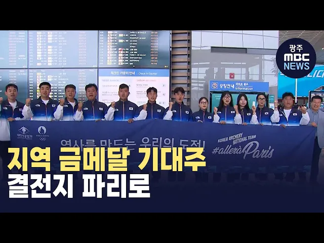 (앵커)파리올림픽 개막이 나흘 앞으로 다가왔습니다.광주는 물론 전남에서도 금메달에도전하는 선수들이 있는데요순천시청 소속 양궁대표팀 남수현 선수,접영 200m 금메달에 도전하는 여수 출신 김민섭 선수들이결전지 파리로 향했습니다.유민호 기자입니다. (기자)파리올림픽 양궁대표팀 막내 남수현 선수.올해 순천여자고...
