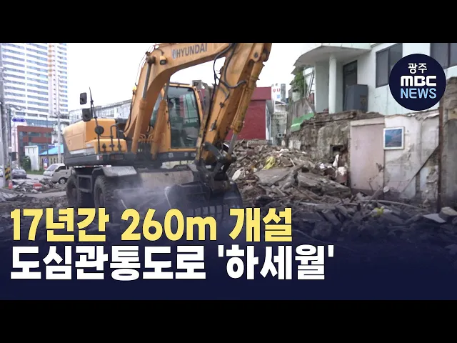 (앵커)공사 착공 17년간 260m를 개설하는데 그친 거북이 도로공사 현장이 있습니다.목포시 원도심 관통도로인데요,공사기간이 늘어나면서 사업비는 두배 가까이 늘고, 원도심 활성화는 요원한 상황입니다.신광하 기자가 보도합니다.(기자)목포시 목원동의 편도 1차로 주변 건물 철거작업이 진행되고 있습니다.장맛비 속에 ...